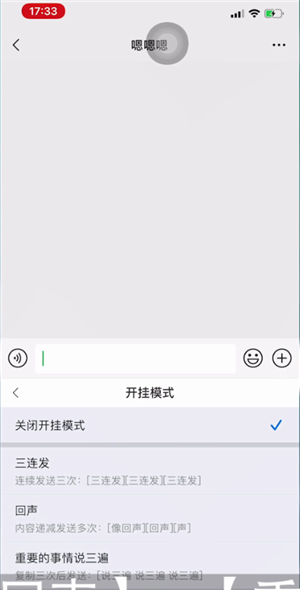 2、点击开挂模式,有【三连发】、【回声】、【重要的事情说三遍】三种模式可选择,