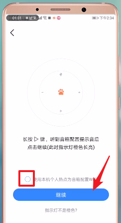 1、将手机连接WiFi,确保与音箱使用同一WiFi;或者打开手机热点,同时在【小度音箱】APP的配网页面勾选“使用本机个人热点为音箱配置WiFi”;