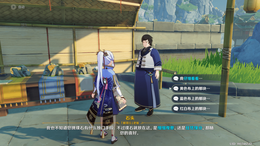 确认后好璞石是哪块后,再次与石头对话,选择上图黄色布上的那块...(这里要注意了,据天舞几次的实验记录显示。这三块石头有可能全部都不是好的,也有可能全部都是好的,完全是随机性刷新。若要完成成就,必须在第一次时就选中,否则无法完成成就)