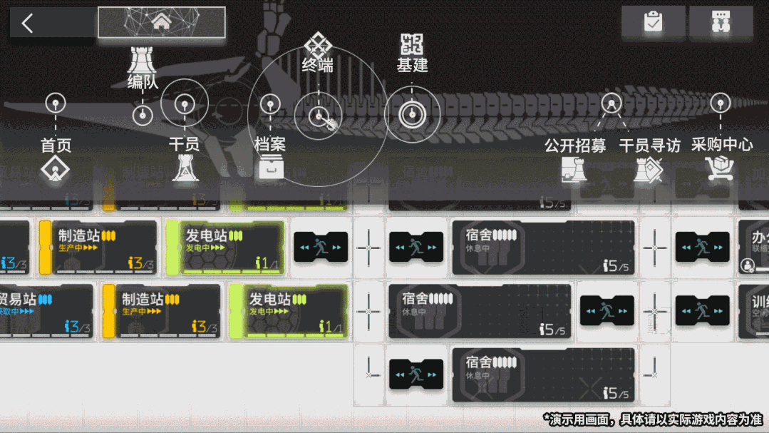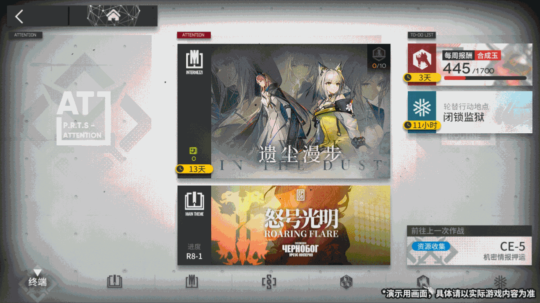 终端主界面将显示目前正开启的活动、您当前的主线进度、本周剿灭报酬合成玉获取进度等信息,您可通过不同的信息入口前往对应的作战关卡。同时,根据当前正在开展的活动类型不同(如Sidestory、故事集、危机合约),终端也将会更新其入口以及其他的活动信息。