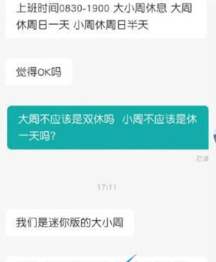 源自一网友的求职经历,对方hr说自己公司的休息方式是大小周,但跟正常的大小周多少是有点出入了,在被质问后重新定义了大小周:我们是迷你版大小周。
