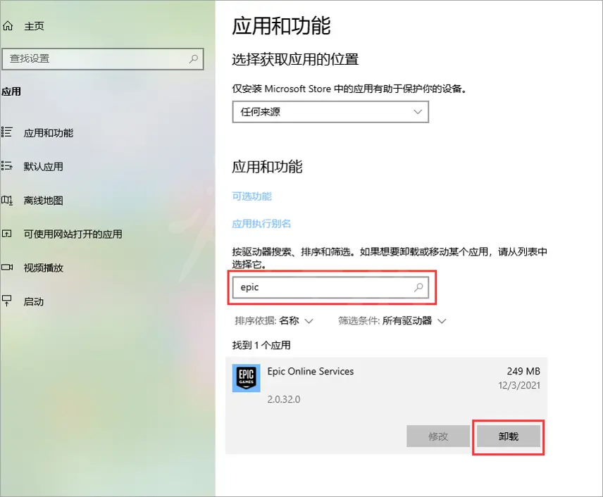 步骤2:进入设置界面,点击应用,在应用和功能中搜索Epic,找到Epic Online Services后点击卸载。