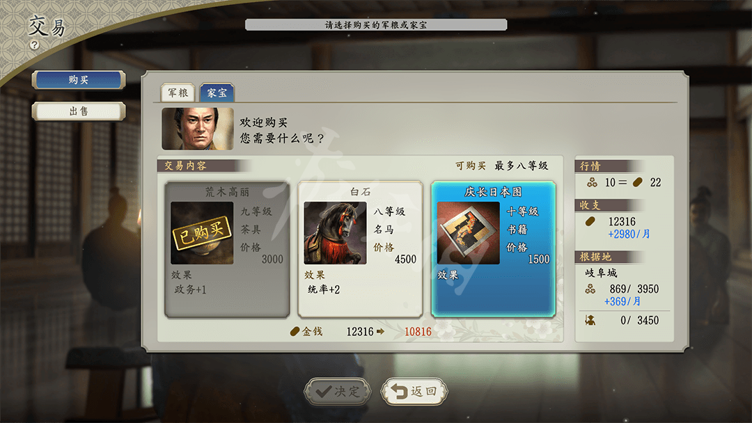 将买到的家宝授予武将,可提升其忠诚和能力。