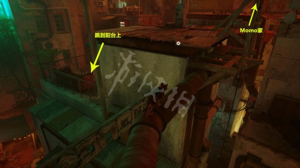如下图,前往Momo家的路上,走到下图位置(往前能看到【能量饮料2】的售货机),从屋顶跳到阳台上。