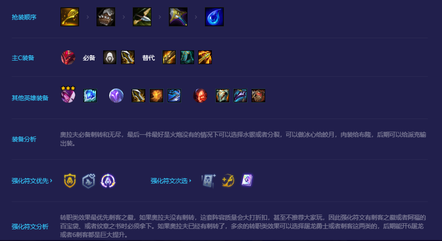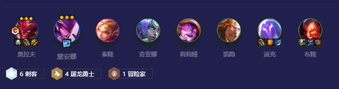 3-2拉6人口D一波,找找体系卡,有刺转直接给奥拉夫,凑4屠龙4刺客,一星也可以稳住血量,4-1在拉7直接D出两星核心卡,能锁血就存钱慢慢D三星奥拉夫,之后根据来牌上8人口开出6刺。