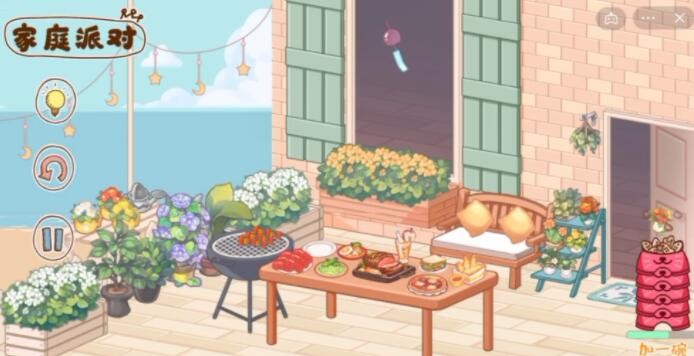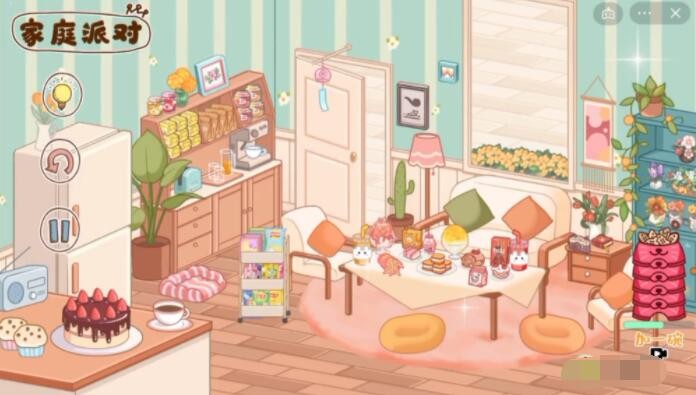1、【家庭派对】分为室内和露台,点击门可以切换。首先将物品从下方的软件中拿出,左边的软件可以拿家具,右边的是食物