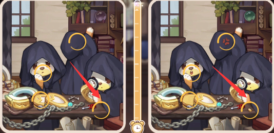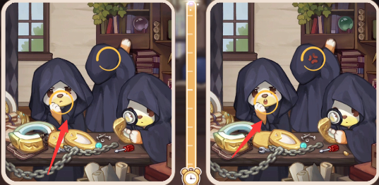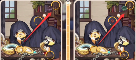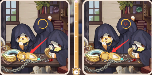 5、我们看右下角桌子上的东西会发现不同,左边没有东西,右边多了个金色颗粒。