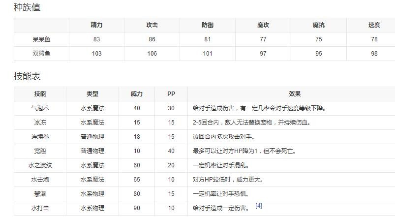 呆呆鱼/双臂鱼种族值和技能如下图: