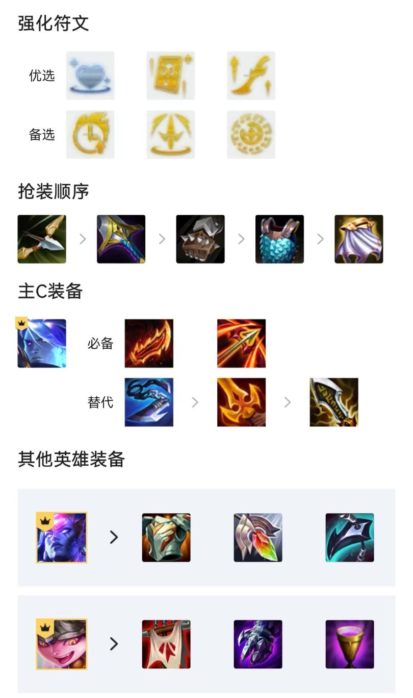 俄洛伊:石像板甲、龙牙、救赎/日炎其他棋子装备有闲钱合成基克先驱,多余腰带出伏击都可给璐璐,多余的输出装备可给橙卡。