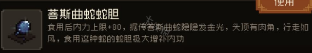游戏中的大蛇被玩家击败后可以获得菩斯曲蛇蛇胆,蛇胆的作用是食用后内力的上限增加80。据传菩斯曲蛇隐隐发光,头顶有肉角,行走如风,食用该蛇胆可以极大补增内功。