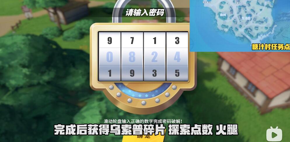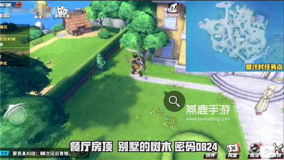 第三个密码:在糖汁村中上的位置,餐厅楼顶的发光物:2;