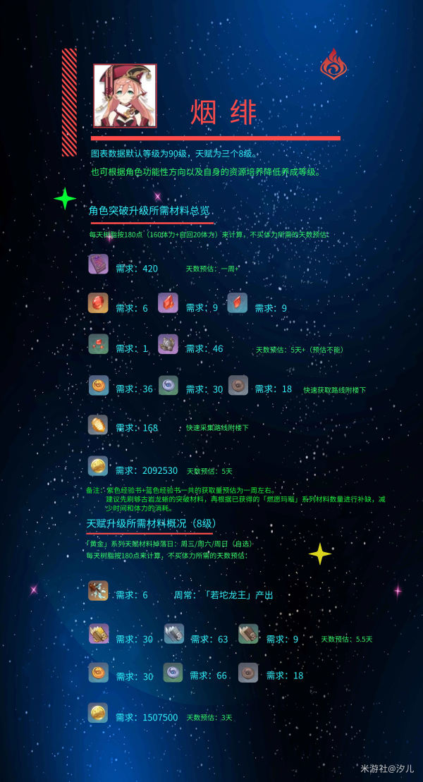 烟绯主要需要爆炎树掉落、未熟之玉以及夜泊石。