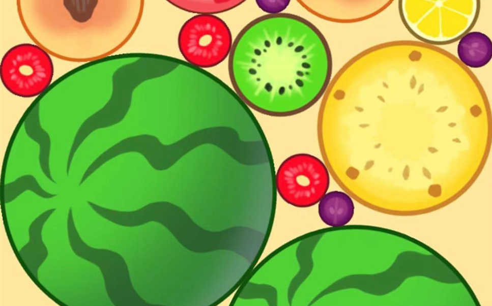 点击紫色的小水果,让它掉落,两个相同的水果会变成大水果,直至合成大西瓜。紫色小水果可以左右移动,控制其下落位置。