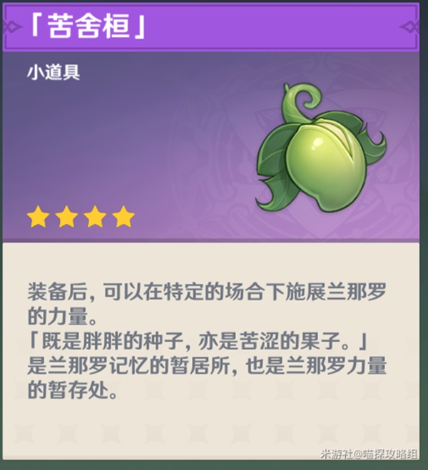 注意事项:咱们需要提前装备好咱们的苦舍桓哦!记得再带上一个草元素角色,一个弓箭角色。