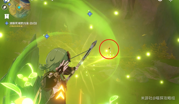 咱们先去解密一号点位,咱们先将视角转到北方向,利用四叶印跟随路上的绿线提示飞过去就好了。