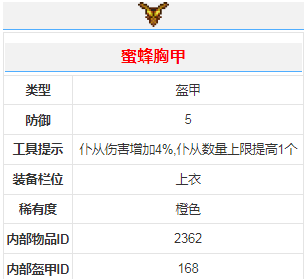 在游戏中蜜蜂盔甲是一套强力的盔甲套装。它是困难模式之前可用的仅有3套仆从强化盔甲。