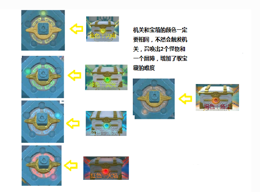1.宝箱有五种属性,分别为金木水火土,同样对应五类机关。