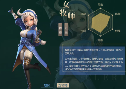 战士权杖与魔杖作战,拥有强大的防御和恢复魔法,负责保护与治疗队友。可以使用多种辅助魔法来应对不同的状况。