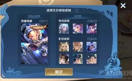 1、首先,生日福利活动期间,您可以选择1个荣耀典藏皮肤、3个直销传奇皮肤和6个直销史诗皮肤免费体验。其中,传说皮肤及以下皮肤还可以分享给队友,相当于送了一张七日荣耀典藏皮肤体验卡。