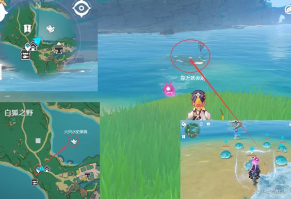 首先来到白狐之野下方的传送点,朝着地图东北方向的浪船锚点跑,靠近之后会刷六只水史莱姆。
