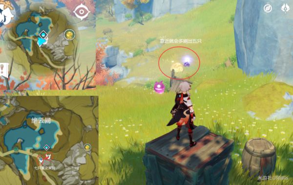 我们来到绝云间下方的传送点,朝着地图的东方向看,就会看见两个雷史莱姆,靠近后会多刷出五只雷史莱姆。