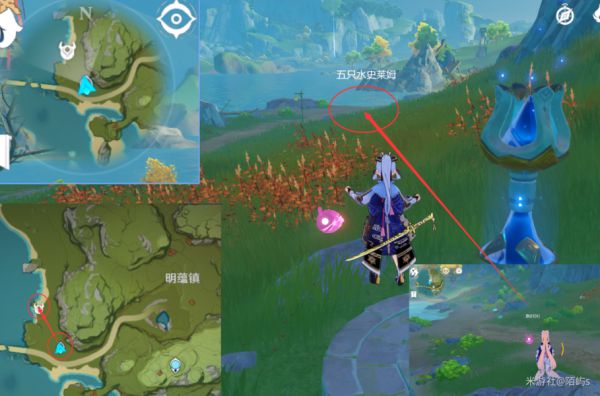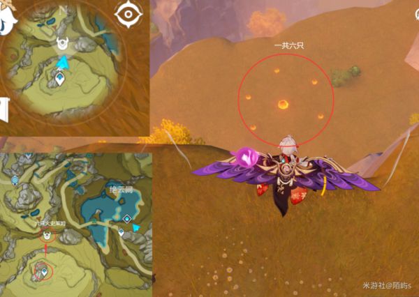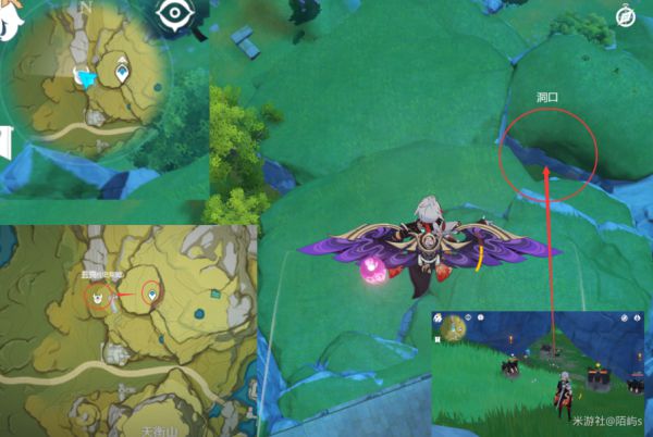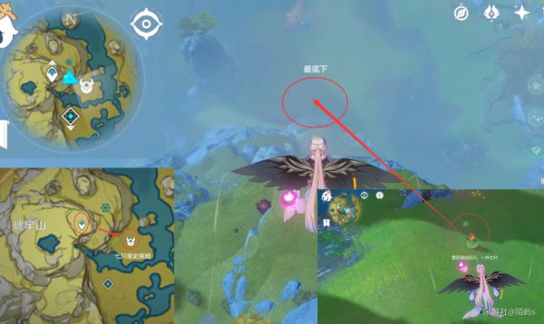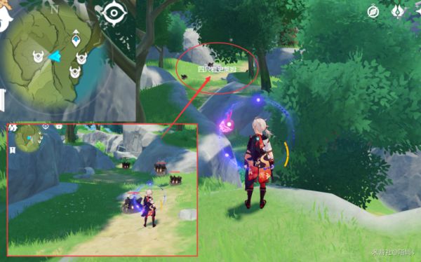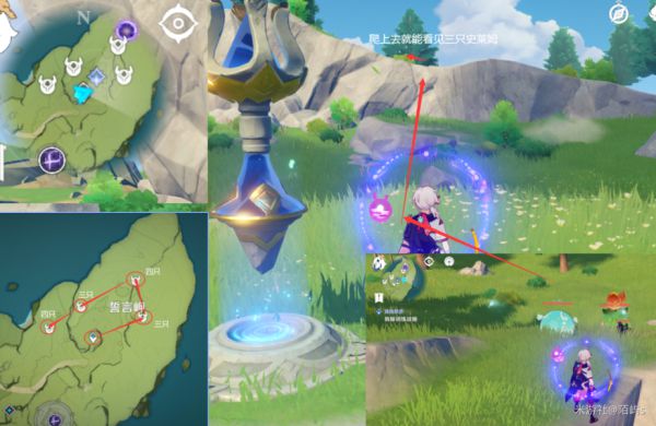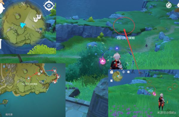 我们来到璃月港右上方的传送点,朝着地图的东方向飞,在这个斜坡上就有四个风史莱姆。