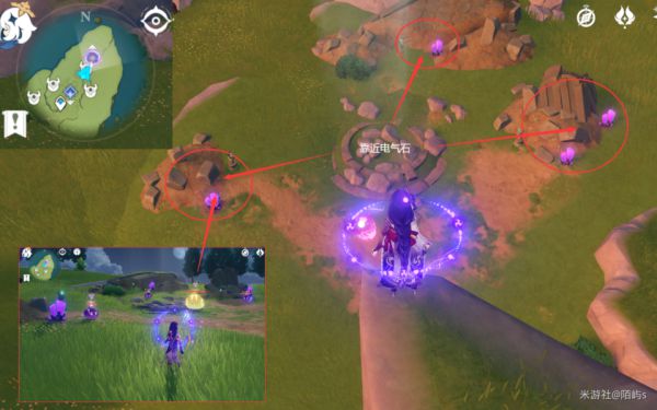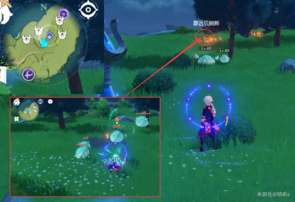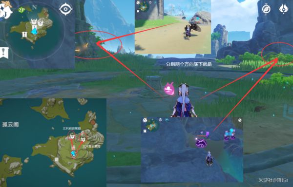 我们来到孤云阁右边的秘境,朝着地图的北方向看,左边下面有三只岩史莱姆,右边下面有三只雷史莱姆。