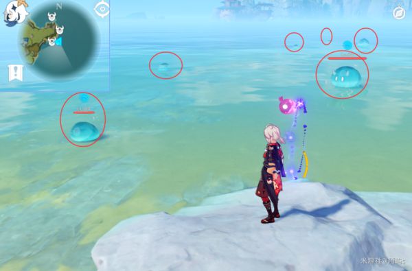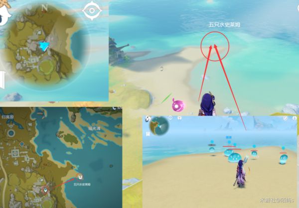 我们来到瑶光滩左下角的传送点,朝着地图的东方向房子的右边海滩飞过去,靠近之后会刷出五只水史莱姆。