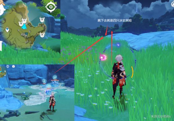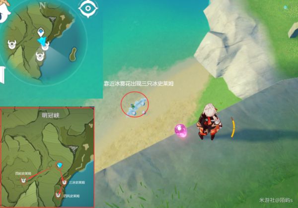 我们来到明冠峡下方的传送点,朝着地图的南方向悬崖跑,咋底下有一朵冰雾花,靠近出现三只冰史莱姆。