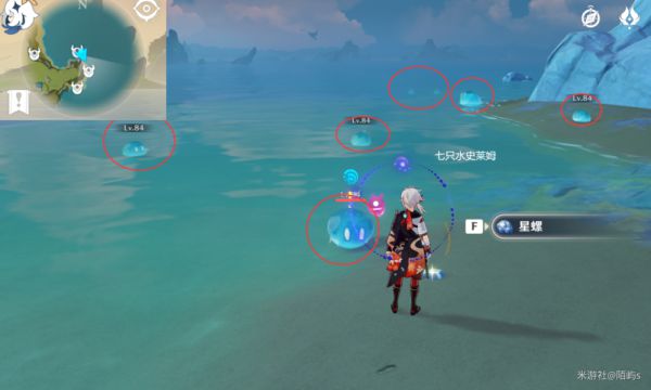 再往前走,就会看见六只水史莱姆在这晃悠,一样的聚在一起嘎掉。