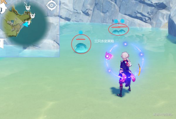 朝着地图东方向跑,在前面的大石块旁边是三只水史莱姆。