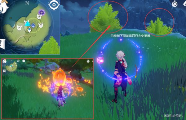 清完风史莱姆朝着地图的西方向看,有两颗白桦树,在树下面就是四只火史莱姆了。