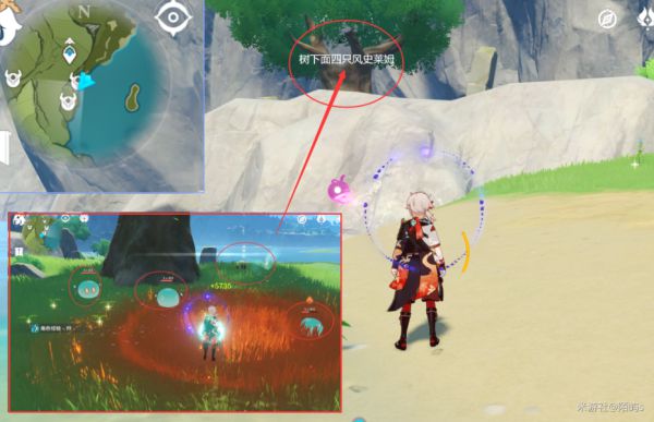 清完冰史莱姆,朝着地图的西南方向爬上去,在树下面就是四只风史莱姆。