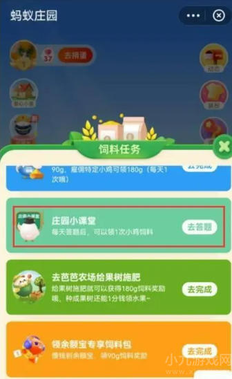 2、点击后选择庄园小课堂,点击右侧的去答题按钮,即可看到当天庄园小课堂的问题;