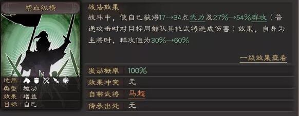群攻效果:普通攻击对目标同部队的其他武将造成伤害(简称:溅射)。普及一下,以普攻伤害是100%计算,那群攻的伤害是根据普攻目标所受的伤害进行的溅射。即主目标打多少,那敌军的另两个队友就会受到马超普攻目标的伤害 * 54%,这就是群攻打出来的伤害数值。
