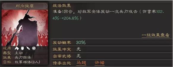 仅普攻就能提供稳定的群体输出能力。搭配强化普攻的战法,以及辅助武将,可以进一步放大马超的输出能力。但由于其惧怕缴械效果,如果让马超获得优越的输出条件 ,是玩好马超的首先要面对的问题。