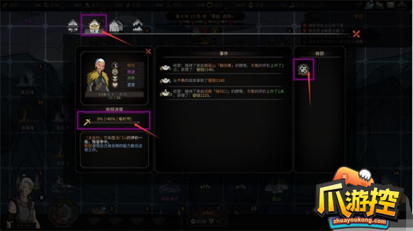 3、最后建好之后收获界面在左上角第二个经营标签,如上图,收获进度满了,右侧就会有产出。需要自己手动收,不会自动收。我就是不知道,傻傻的等了两年。不过,2年后,赌场和驿站,我收了1.5W有收入的需要一个能力强的人来管,我这个小管事儿的40%/每时节,意味着3个时节就能收一次。至于第三年是否余留20%的进度我还没注意,有待观察。
