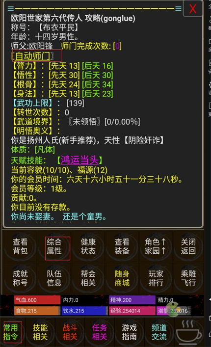 因为自动师门的配套武学天佑拳只能在300W经验之前有效,所以这里建议萌新开局就直接自动师门,以免经验太高又不熟悉技能无法打过师门。