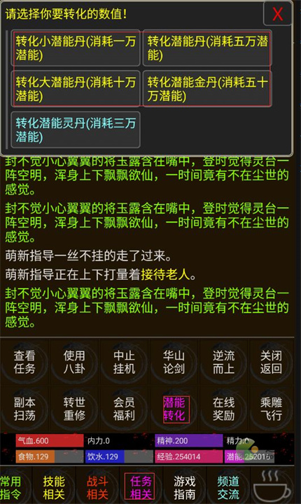 你可以看到这时候你的潜能上限只有90万,这就造成你挂机途中有可能经验会超过上限,超过上限每次师门收益只有1潜能。而经验的上限和你的悟性有关,所以自动师门的时候要么经常把潜能转化成潜能金丹: