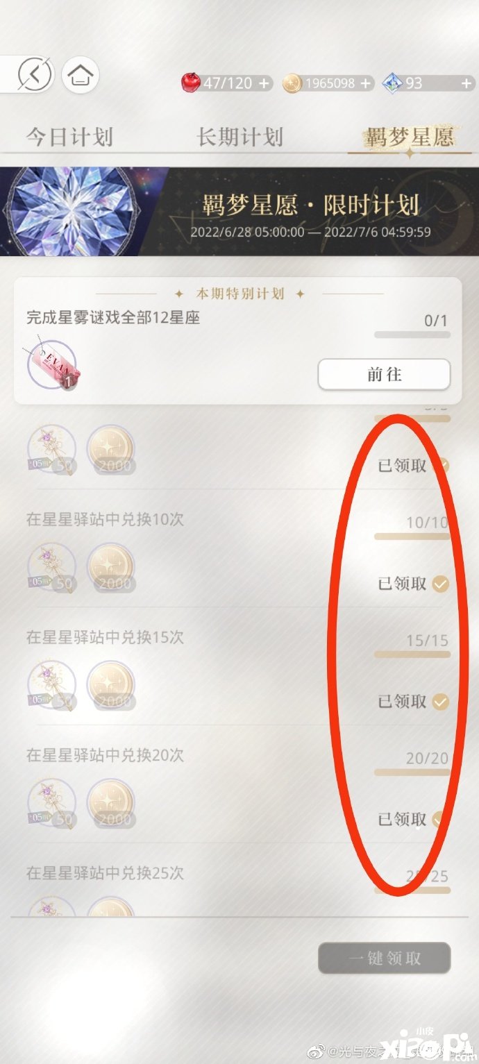 羁梦星愿计划里,星星驿站兑换50次总计可领取500星光手杖,还有个共鸣汲取+点亮一个普通星星+点亮一颗闪亮星星,这三个加起来也有100星光手杖。p1