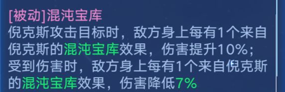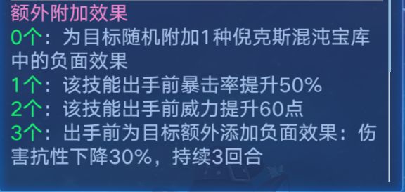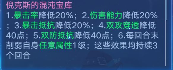 ②混沌宝库效果添加不会重复,比如对面目标甲已经有效果1了,那么倪克斯添加效果时,就不会给它添加效果1,而是添加效2、3…(方便快速叠加多种效果)