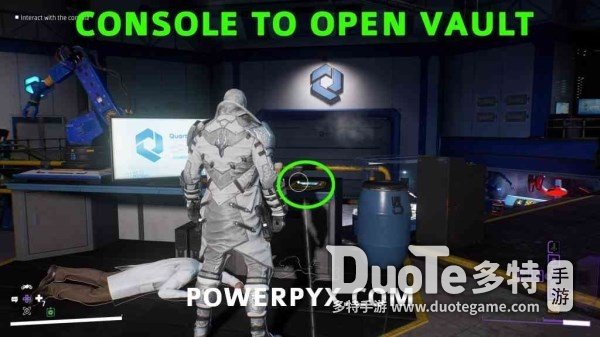 击败房间内的敌人后,楼上有个控制台开关就在金库门的正前方。按【十字键-下】扫描并高亮,与之互动解开开启金库。