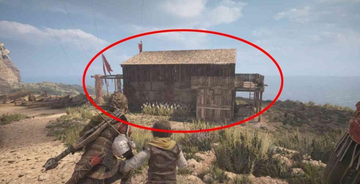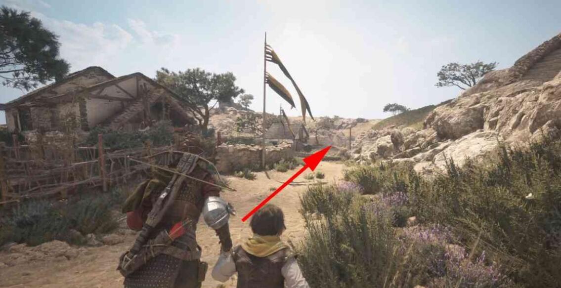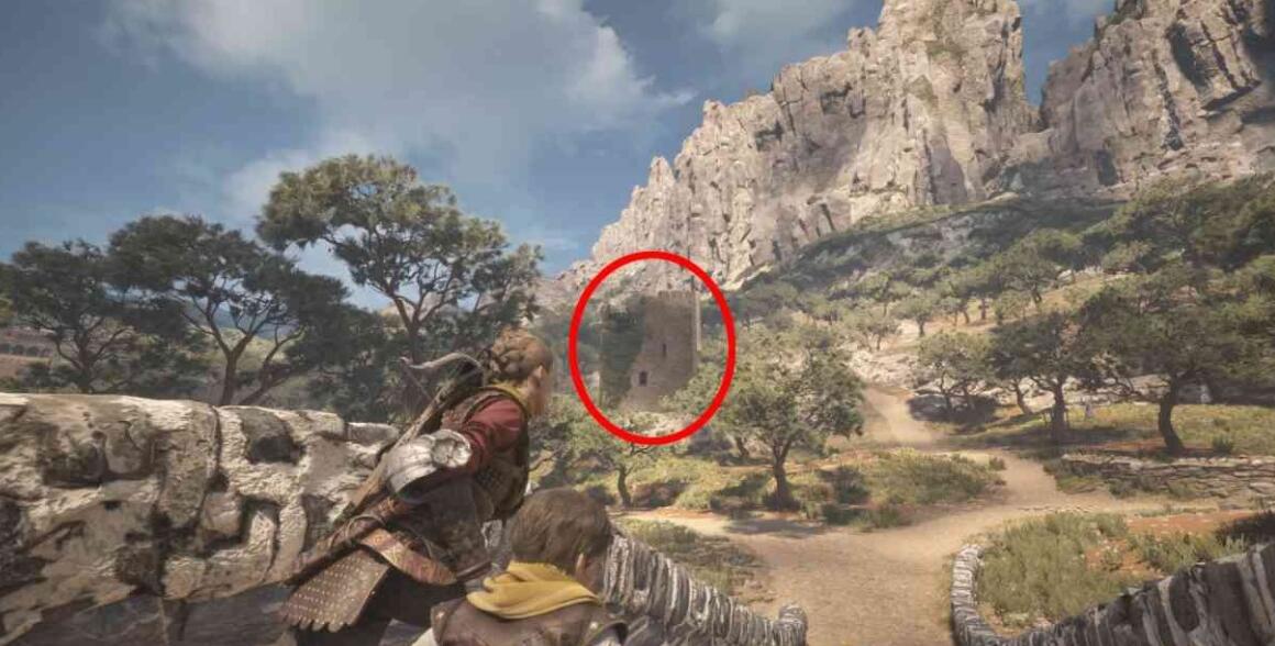 跟着大鸟雕像走,朝着远处的双子山前进,过桥后前往左手边的塔楼(如下图),先从窗口处打断铁门的锁,然后进入塔楼,推开铁门在门后的木桶上拿到短刀(如果手里还有短刀,那么可以先去开箱子,完事后再回来拿)。