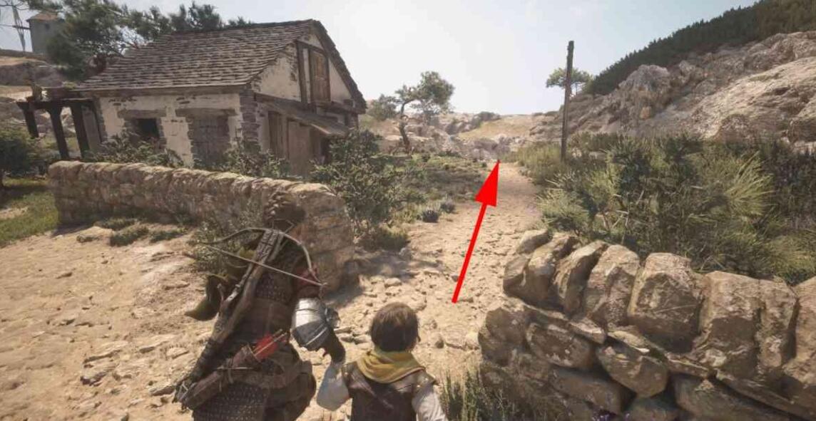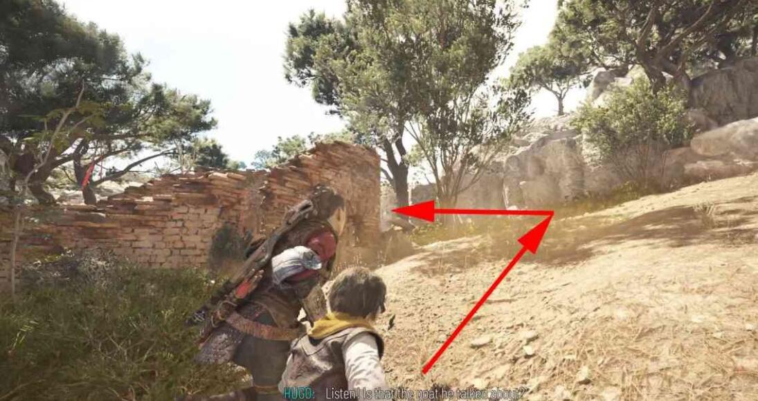 想个办法绕过卡口,继续向着双子山前进,与养山羊的农夫交谈后,沿着斜坡往上走,来到左前方的破败建筑前。