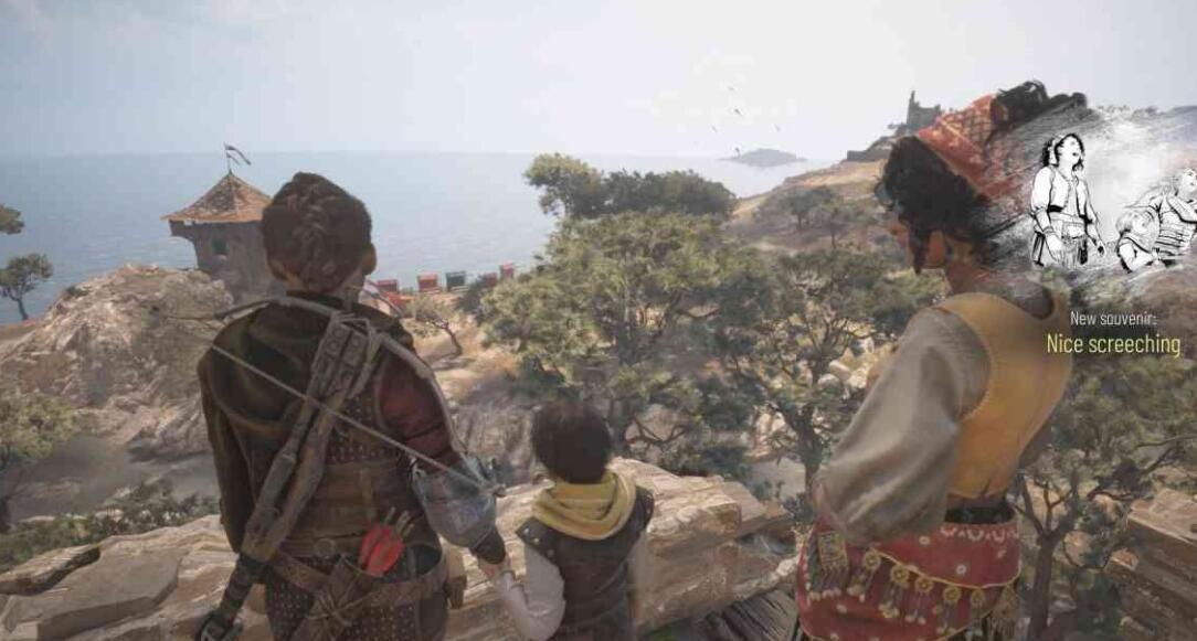 想个办法绕过卡口,继续前进,注意闯入禁地后不能被发现,也不能杀死任何敌人!潜行通过两个区域后,进入塔楼,沿着楼梯爬到顶部,在小路尽头的树枝旁拿到羽毛。