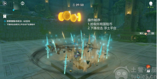 利用魈的行踪进行攻击,将“藤球目标”敲回地面,捡起冒险币获得积分。