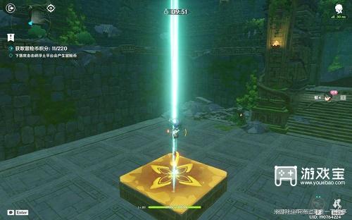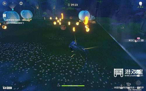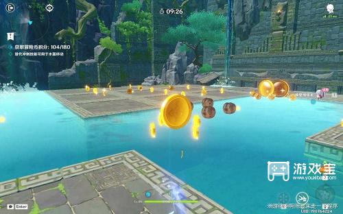 使用神里绫华的天赋技能代替冲刺在水面移动以获取金币。小心脏脏弹,被击中会遮挡视野。没体力了可以通过获取场上的光点来恢复。