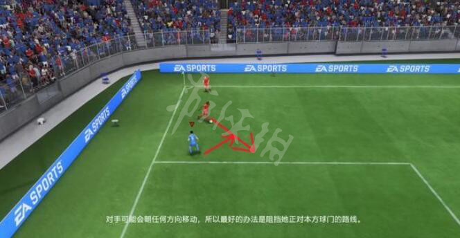 在进行防守时,需要阻拦对手攻进我方禁区,一般情况下,挡在对手的前进路线与我方球门中间,即可迫使对手做出回避动作。