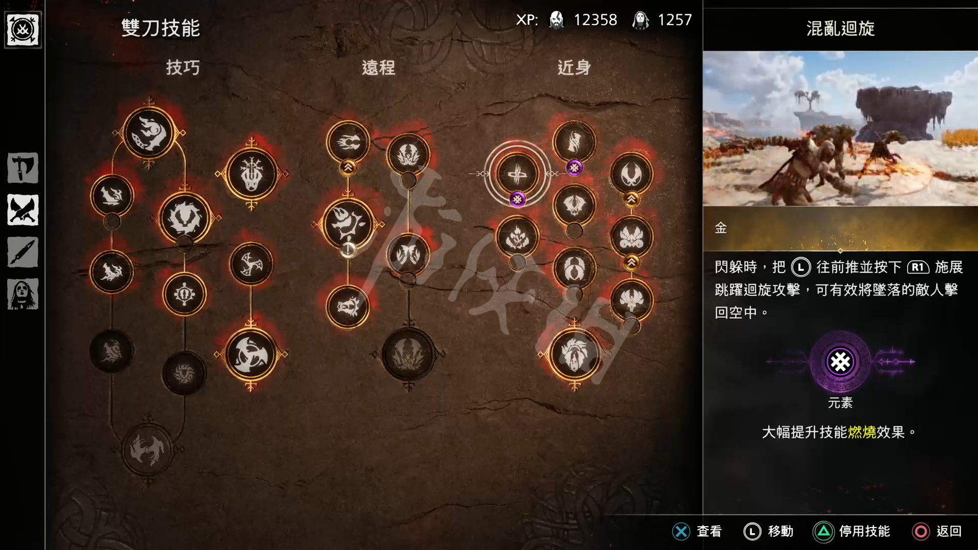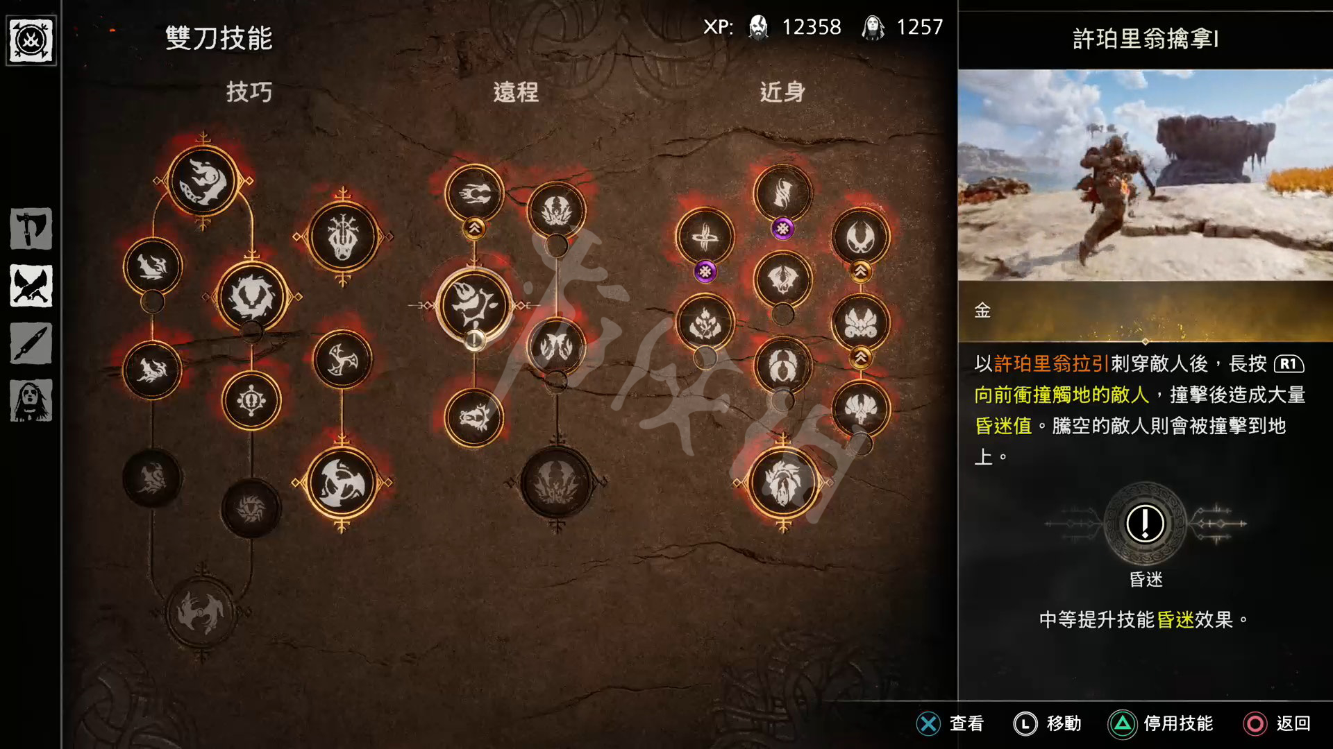 个人较倾向近战系列技能,不过早中期而言双刀的技巧系列招式(按实三角形)比斧头好用,主要是不需要蓄满就能出招(当然蓄满的话威力更高),而且招式的硬直 / 吹飞效果也很好,以至于可以不停连出同一样来“stun lock”对手屈到死。特别推荐要尽早学习“许珀利翁擒拿”,有了这招之后对付人型敌人就会轻鬆很多。