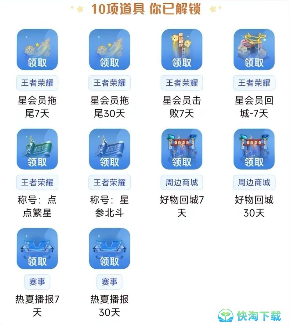 1、1-9级奖励:限定称号两个,限时7天和30天的星会员拖尾、星会员击败特效、星会员回城、好物回城以及热夏播报。